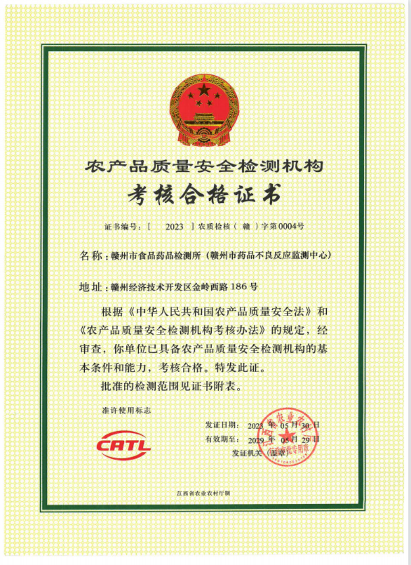 食药检所农产品质量安全检测机构考核合格证2023.05.30-2029.05.29