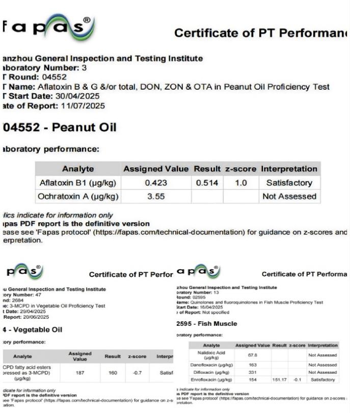 FAPAS 作为全球实验室能力验证的“金标准”,其评价结果在国际实验室间互认体系中极具权威性。市综检院参与的 “鱼肉中恩诺沙星残留量测定”“花生油中黄曲霉毒素B1检测”“植物油中三氯丙醇酯含量测定”3项项目,均为食品安全风险监测的“硬骨头”指标,直接关系群众饮食安全,最终全部获得“满意”评价。与此同时,在中国检验检疫科学研究院组织的“腐竹中二氧化硫含量测定”国家级能力验证中,市综检院同样交出优异答卷。这些成绩的背后,这些成绩背后,是检测团队对“科学、公正”的坚守,既彰显赣州检测技术的国际竞争力,也为守护“舌尖上的安全”筑牢防线。