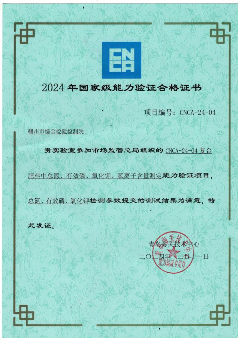 日前国家市场监督管理总局发布复合肥料中总氮、有效磷、氧化钾、氯离子含量测定能力验证报告国家富硒与油茶产品质量检验检测中心江西(以下简称中心参加的总氮、有效磷、氧化钾”三项能力验证均获满意结果。化肥产品是重要的农用物资,本次能力验证标志着中心在化肥产品检验领域已达到国内先进水平,为保障春耕备耕提供强有力的技术支撑。
