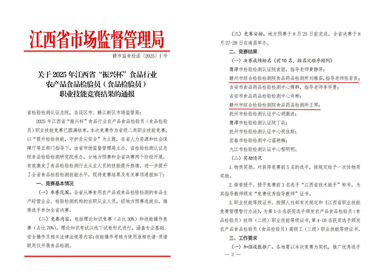 近日,2025年江西省“振兴杯”食品行业农产品食品检验员职业技能竞赛圆满落幕,市综检院食药检所刘雅茹、王琴两位同志在竞赛中脱颖而出,分获决赛第二和第五名的优异成绩。