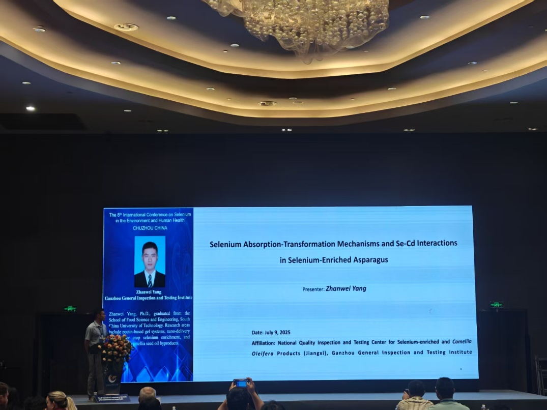中心杨占威博士以《Selenium Absorption, Transformation, and Se-Cd Interactions in Selenium-Enriched Asparagus》为题,在会议上作英文口头学术报告,系统介绍了中心在富硒农产品领域的研究进展,展示了硒在植物体内的转化机制及其与重金属元素相互作用的科研成果。