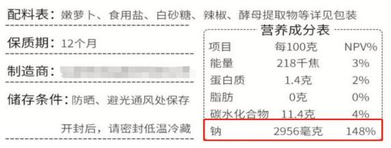 如果喜欢吃腌菜,就一定要减少食盐的用量, 比如吃了 20 克下图这款辣萝 卜条,就会多摄入 1.5 克盐,那么建议 全天做菜的时候少放 3 小捏食盐,如果能将腌菜涮一下水 再吃会更好。
