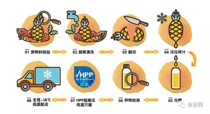 首先同样从新鲜水果中直接榨取果汁,然后将果汁装瓶后,放入高压设备中,施加超过 600 兆帕(MPa)的高压。这种高压可以杀死果汁中的有害细菌和酵母,同时最大限度保留果汁的营养成分和风味。最后,高压处理后的果汁通常会在冷藏环境下储存,以延长其保质期。