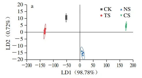 采用电子鼻测定了CK组、NS组、TS组、CS组生鲜鲢鱼片的气味特性,电子鼻传感器响应值的LDA结果和雷达图见图4。如图4a所示,4 组样品的气味特征第1判别因子和第2判别因子的累计方差贡献率为98.17%,说明电子鼻各传感器响应值能较全面地反映样品信息。4 种宰杀方式制备的生鲜鲢鱼片气味轮廓有显著差异,TS组和NS组样品的气味轮廓部分相似,但明显不同于CK组和CS组样品,说明宰杀方式对鲢鱼片风味品质有显著影响。如图4b所示,生鲜鲢鱼片气味差异主要体现在S4、S5、S6、S7、S8、S11、S12、S13、S14、S18、S19、S21、S22、S23、S25、S26及S27传感器,分别代表硫化物、含氮物质、醛酮类物质、烷烃、芳香族等化合物,说明4 组生鲜鲢鱼片气味特征的差异主要体现在上述物质中。因此,需通过GC-MS技术进一步了解并分析生鲜鲢鱼片中挥发性气味物质组成的差异。