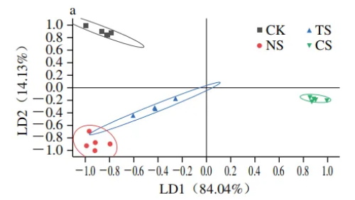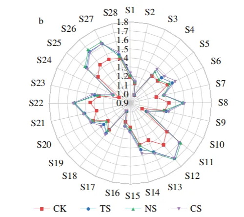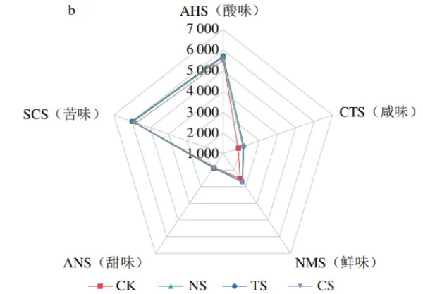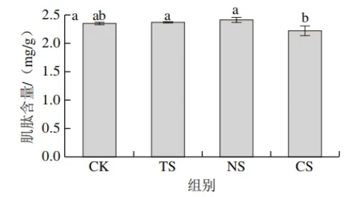 肌肽是由β-丙氨酸和L-组氨酸组成的二肽,是一类呈味物质,且与味精有协同增鲜的作用,对水产品具有明显的增鲜和提味作用。从图3a可以看出,TS组和NS组样品的肌肽含量与CK组样品无显著差异,但显著高于CS组样品。