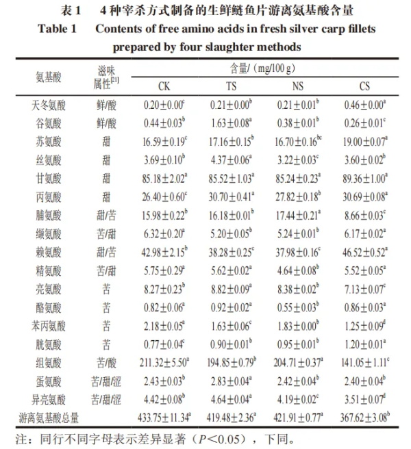 二、宰杀前放血和冷胁迫对生鲜鲢鱼片游离氨基酸含量的影响