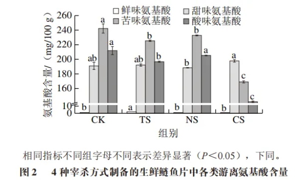 从图2可知,TS组样品的鲜味游离氨基酸含量显著高于其他3 组;CS组样品的甜味氨基酸含量显著高于NS组样品,与TS组和CK组无显著差异。CK组样品中苦味氨基酸含量显著高于TS组和NS组样品,而TS组和NS组的苦味氨基酸含量又显著高于CS组样品,CK组、NS组、TS组、CS组样品中苦味氨基酸所占总氨基酸含量的百分比分别为55.86%、55.20%、53.74%、45.99%。这与陈剑岚等研究宰杀方式对草鱼呈味水溶性成分影响的结果一致,他们发现鱼血中苦味氨基酸含量占总游离氨基酸含量的70.28%,推测击晕处理尽管可以减轻鱼体应激反应,但会导致鱼血渗入肌肉组织中,从而使血液中较高含量的苦味氨基酸影响了肌肉中氨基酸含量。CK组和NS组样品中酸味氨基酸含量显著高于TS组和CS组。综上所述,放血处理和冷胁迫处理可增加鲢鱼片的鲜味、甜味氨基酸含量,减少苦味和酸味氨基酸含量,从而增加鱼肉的鲜甜味。这与上述TS组鲜味响应值最高,CK组、TS组和NS组苦味响应值均高于CS组的电子舌结果相印证。可见宰杀前进行放血处理和冷胁迫处理可以减少鱼肉中的血液残留,改善生鲜鱼制品的滋味品质。