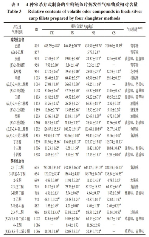 鲢是我国养殖产量最大的滤食性淡水鱼,在养殖期间易产生不良风味,导致其风味品质下降。鱼肉的风味品质复杂而又多元,不仅受鱼种、生长发育、养殖环境等多种因素的影响,致死方式也是影响其挥发性成分的重要因素之一。宰杀是生鲜鱼制品加工的第一道工序,现有研究表明宰杀方式对鱼肉的食用品质和安全性有显著影响。