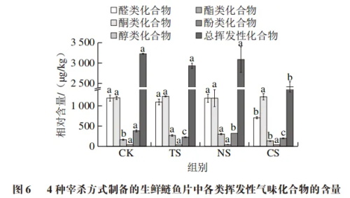 宰杀方式对生鲜鲢鱼片滋味特征和滋味化合物、气味特征和挥发性化合物有显著影响。放血和冷胁迫处理可以增加鲢鱼片的鲜味、甜味游离氨基酸的比例,减少苦味、酸味氨基酸含量,从而增加鱼肉的鲜甜味。与击昏即杀组相比,放血和冷胁迫处理组生鲜鲢鱼片中ADP、GMP和AMP含量均降低,而HxR含量显著升高。与CK组相比,TS组、NS组和CS组样品中具有鱼腥味、油脂味、鱼油味和过熟味的庚醛、(E)-2-庚烯醛、壬醛、癸醛、(E,E)-2,4-癸二烯醛、2,3-辛二酮等气味化合物含量明显降低,而具有坚果味、黄油味的(E,E)-2,4-庚二烯醛、2,3-戊二酮等挥发性气味化合物的含量明显增加,结果表明放血处理和冷胁迫处理可明显改善生鲜鲢鱼片的气味品质。