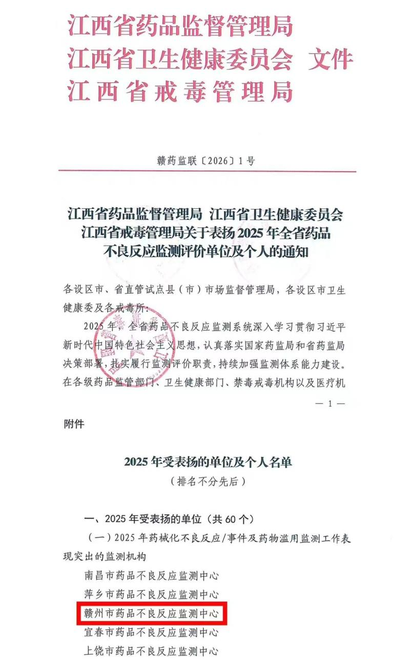 日前,江西省药品监督管理局、省卫生健康委员会、省戒毒管理局联合发文,赣州市药品不良反应监测中心(以下简称“赣州中心”)获评“2025年药械化不良反应/事件及药物滥用监测工作表现突出的监测机构”。至此,赣州中心已连续十年获此省级殊荣。